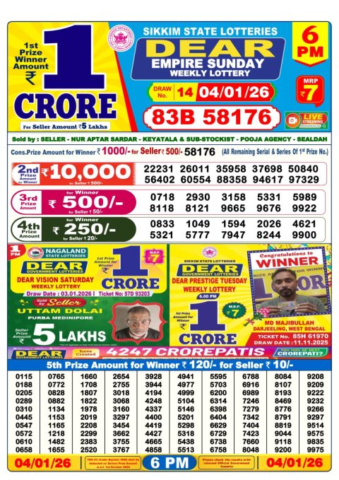 0 Comment on आजকের डিয়ার লটারি সংবাদ 6 PM Result West Bengal 04-01-2026